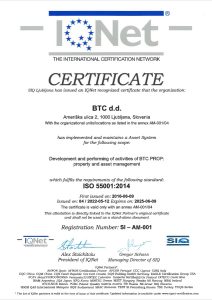 BTC is the first company in Slovenia to receive the ISO 55001 Asset Management System Certification. The certificate was awarded for quality in the management of properties and business partner assets by the Slovenian Institute of Quality and Metrology (SIQ) following a successful audit of the BTC PROP business unit. BTC is among the first recipients of these certificates that are awarded by IQNet – an international network of partner certification bodies that assess management systems. The organisation issues a quarter of the world’s annual management system certifications.