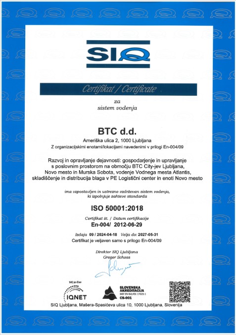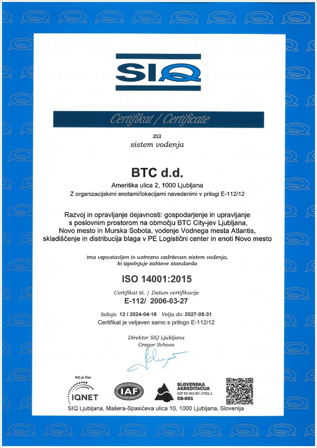 The company places special emphasis on the treatment of waste, packaging, protection of water and air and rational energy consumption. In 2006 BTC acquired the ISO 14001 Environment Management System Certification in the field of property management in the BTC City Ljubljana area and the Atlantis water park. In 2009 the certification was expanded to include logistics. BTC thus acquired an internationally recognised approach to property management and showed its responsible attitude towards the environment.