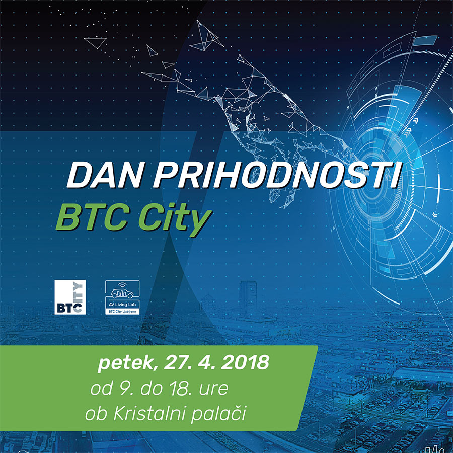 V petek, 27. aprila 2018, družbi BTC in AV Living Lab organizirata Dan prihodnosti v BTC Cityju Ljubljana. Dogajanje, ki bo potekalo med 9. in 18. uro, bodo zaznamovali avtonomna vožnja, električna mobilnost in predstavitev novega plačilnega sistema EliPay, ki omogoča plačevanje s kriptovaluto v fizičnem svetu. Dogodek, ki bo gostil številne visoke domače in tuje politične predstavnike in gospodarstvenike, je odraz priznanja organizatorjem, da na slovenskih tleh v BTC Cityju Ljubljana razvijajo napredno in primerno infrastrukturo za testiranje tehnologije za mobilnost prihodnosti.