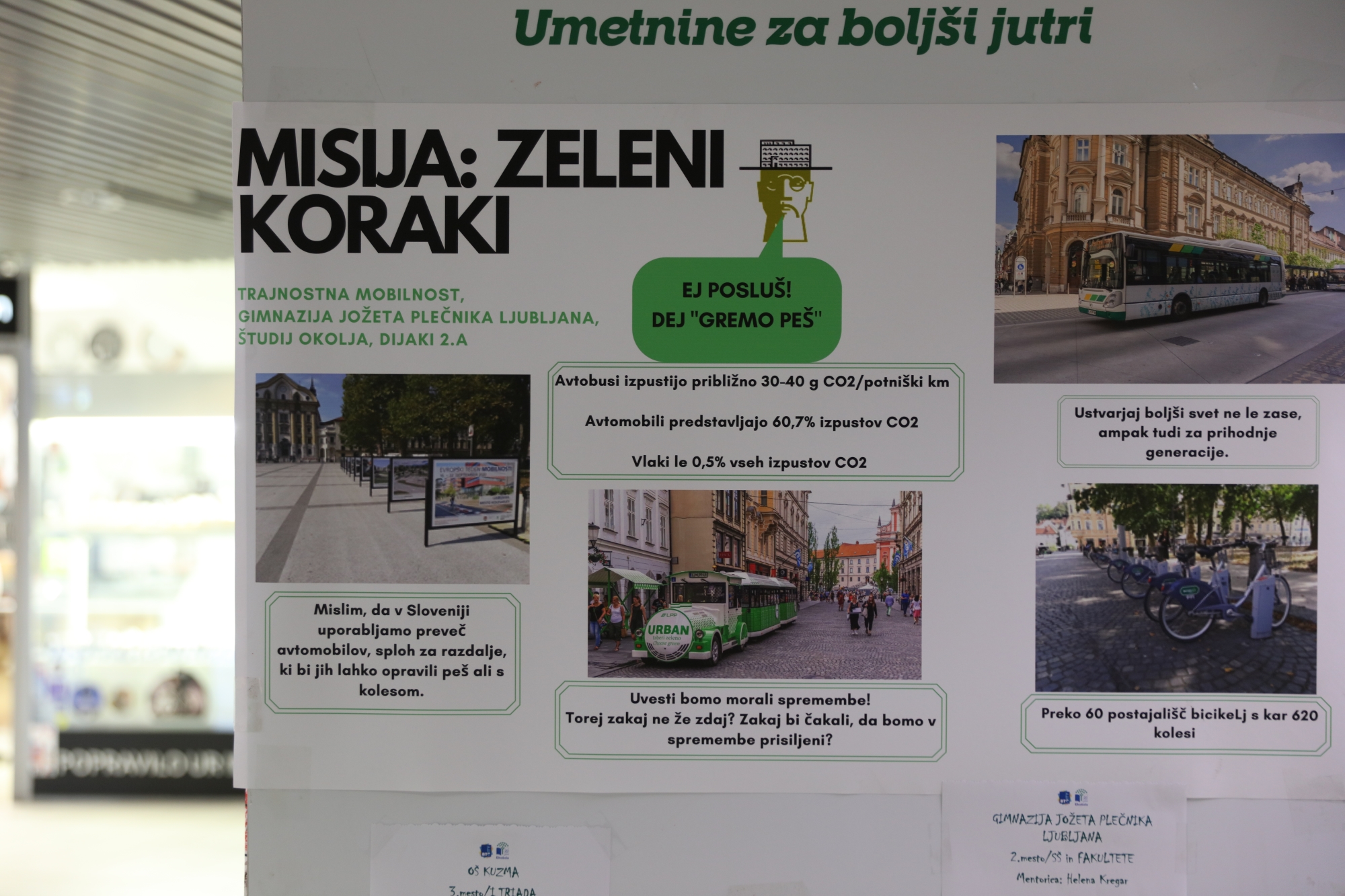 Ali in kako lahko spreminjamo svoje potovalne navade – na poti v šolo, službo, po vsakodnevnih opravkih? Kakšen je ogljični odtis razreda, učenca, šole v prometu? Ali vemo, kako ga zmanjšati? Ali smo to pripravljeni storiti? Kakšen vpliv imajo na okolje transportne poti izdelkov, ki jih uporabljamo vsak dan? To so vprašanja, s katerimi se je v letošnjem šolskem letu ukvarjalo 1.600 ekošolark in ekošolarjev iz 60 vrtcev, osnovnih in srednjih šol v projektu Misija: Zeleni koraki. Ta je v petih letih k sodelovanju privabil že več kot 10.000 otrok in mladih iz cele Slovenije. Razstava izdelkov, ki so nastali v projektu, je na ogled v kleti Dvorane A v BTC Cityju v Ljubljani od 16. junija 2021.